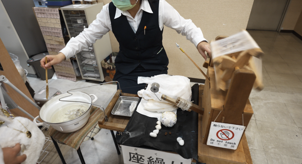 見どころは、 実演されている方の指先をよく見ると、糸が魔法のようにスルスルと引き出されていますが、これはお湯の温度と引き出す速度の絶妙なバランス(熟練の技)によるものです。
